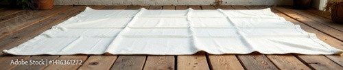 Vintage white tablecloth spread on an old wooden floor, vintage, white cloth texture