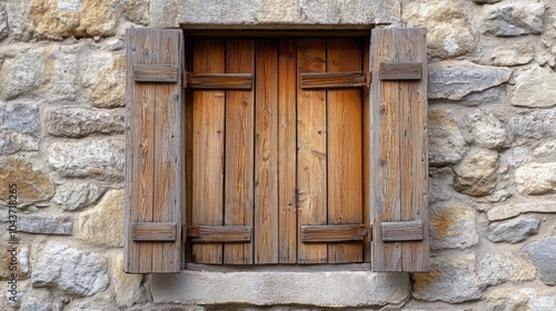 Vintage wooden window shutters opened on a textured stone wall showcasing architectural charm Retro style enhances the character of this classic building
