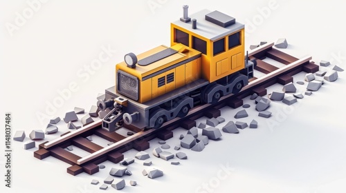 Vintage yellow toy locomotive engine running on railroad track surrounded by stones and rocks evoking a sense of nostalgia and transport through time