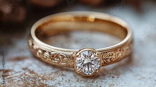 Vintageinspired wedding ring with an engraved gold band set against a plain minimalistic background highlighting its classic and elegant design