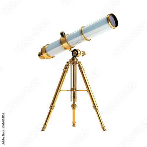 Vintage-style telescope on a wooden tripod stand, isolated, transparent background, white background, no background