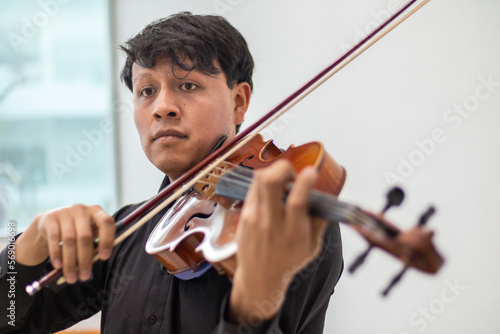 viola player, hispanic violinist or violist close up, young man playing viola. latin hispanic violin player playing viola or violin