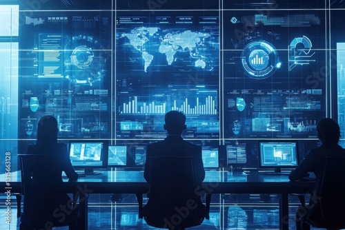 Virtual conference room with avatars engaged in collaborative business meetings displaying complex data visualizations and analytics trends