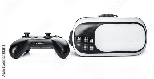 Virtual Reality glasses and game pad Isolated on white background.