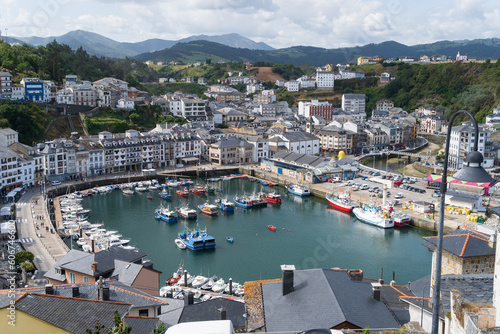 Vista aérea del puerto y la ciudad de Luarca en Asturias, España.