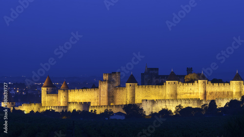 Vista de las murallas de la ciudad de Carcassonne poco antes del amanecer. Languedoc. Francia
