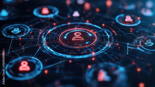 Visual representation of digital network connections and user interactions in a futuristic setting