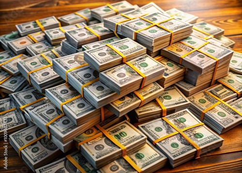 Visual Representation of One Million Dollars in Cash Stacks and Bundles on a Wooden Table Surface