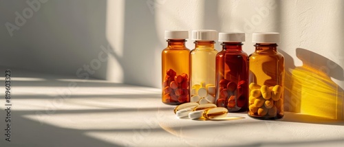 Vitamin bottles on a plain white background with soft shadows