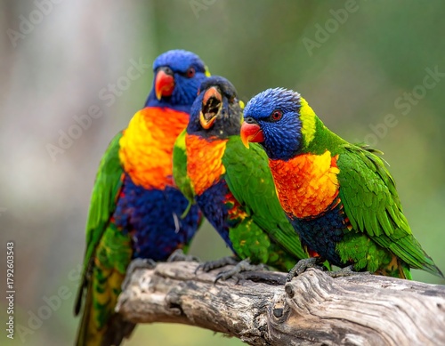 Vivid close-up of three colorful birds perched on a weathered branch. Their bright plumage and beaks offer a striking contrast
