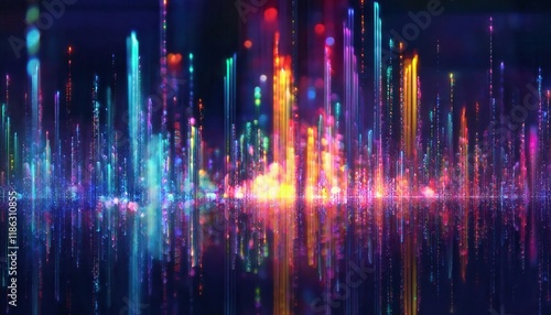vivid digital light beams with glowing multicolored particles in a futuristic abstract pattern, ideal for tech background or events