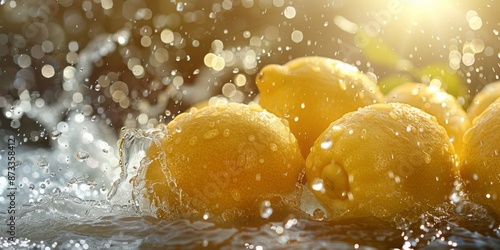 Vivid Fresh Lemons in Water Splash with Bokeh and Sunlight