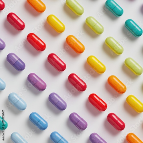 Vivid Multicolored Capsules Neatly Arranged in Diagonal Rows on White.