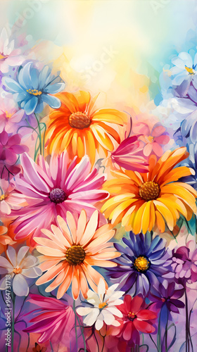 Vividly colorful bouquet of various flowers in intricate detail, showcasing a harmonious blend of colors and textures, perfect for decorating or gifting.
