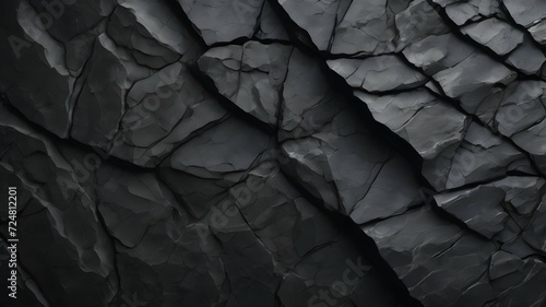 Volumetric rock texture with cracks. Black stone background with copy space for design.