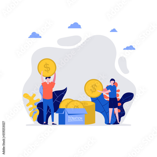 Volunteers at work. Happy young couple, man and woman donating coins together. Concept of volunteering and charity social. Flat cartoon character design for web landing page, banner