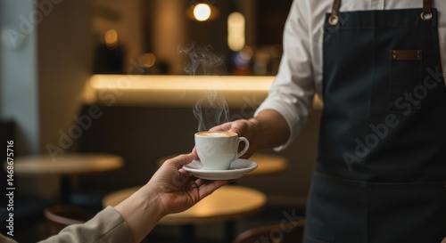 Waiter handing a cup of hot coffee to a customer in a cafe.