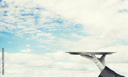 Waiter holding empty silver platter ready for product or item placement