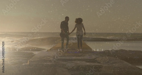 Walking casual couple holding hands along concrete pier at sunset with guitar waves reflecting