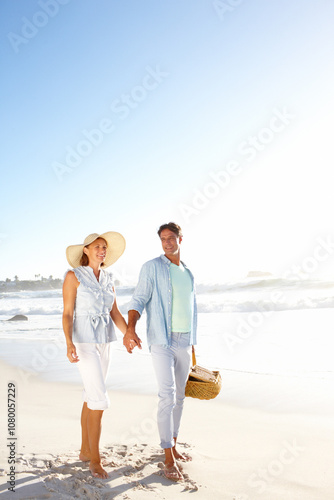 Walking, holding hands or couple at sea for love or date on vacation, anniversary or honeymoon holiday. Basket, picnic or people with smile at beach to relax together for travel, bonding or ocean