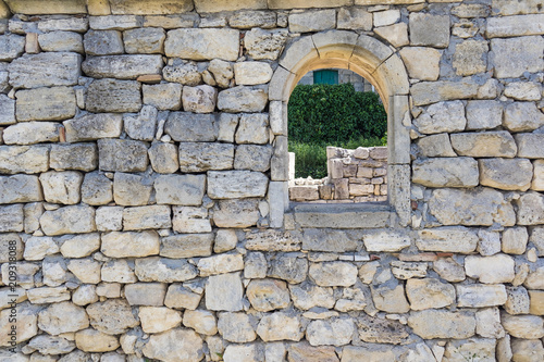 wall with a window in the ruins of an ancient city overlooking the wall with a door, selective focus