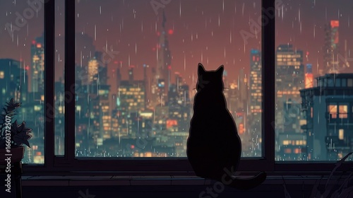 Wallpaper of a black cat sitting on a windowsill looking out over the city at night while it rains. The cat appears to be observing the city, and the scene conveys a sense of peace.