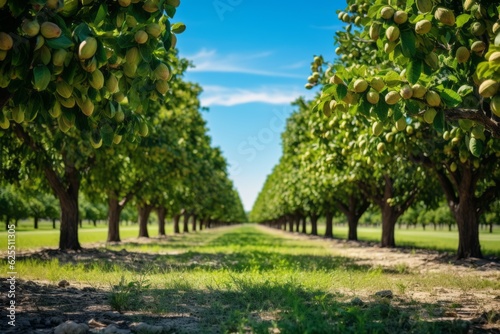 Walnut Orchard With Trees Full Of Mature Walnuts, Generative AI