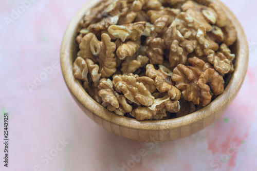 Walnuts kernels, peeled nuts in a wooden bowl on a pink background