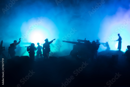 War Concept. Military silhouettes fighting scene on war fog sky background,