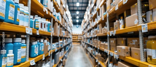 Warehouse aisle with stocked shelves filled with various supplies, boxes, and items. Organized storage in a large industrial facility.