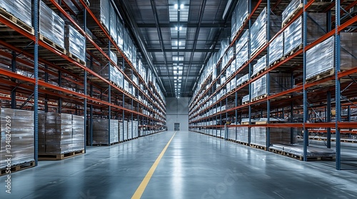 Warehouse interior with rows of shelves and pallets. Industrial background