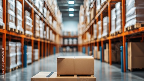 warehouse management inventory warehouse layout Concept. Warehouse interior with stacked boxes and organized shelves in the background.