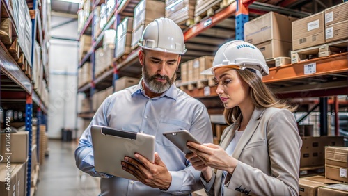 "Warehouse Supervisors Inspecting Inventory Shelves"