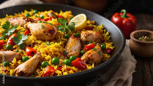 Warm and rustic chicken paella with fluffy saffron rice and seared chicken. Perfect for heritage cuisine campaigns, seasonal menus, or cozy dinner features.