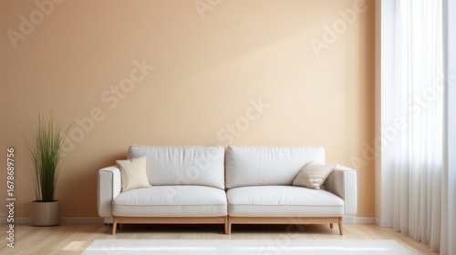 Warm beige living room with white sofa, soft daylight, and copy space