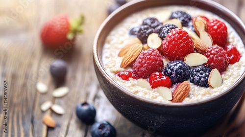 Warm bowl of oat porridge enriched with seasonal berries and almonds, perfect for a comforting meal. Oat porridge provides a delightful texture and flavor, ideal for breakfast. Copy space available.
