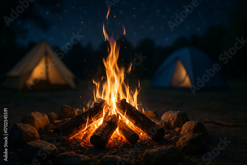 Warm Campfire at Night with Blurred Starry Sky, Cozy Outdoor Camping Scene in Nature, Glowing Firewood Flames