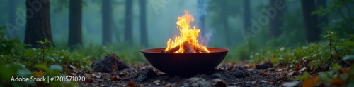 Warm campfire glowing in a serene forest, creating a peaceful outdoor atmosphere.