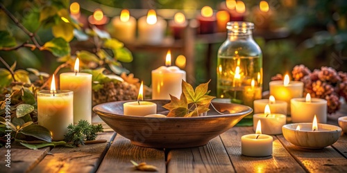 Warm Candlelight Glow in Wooden Bowl with Autumn Leaves, candlelight, autumn, spa , relaxation