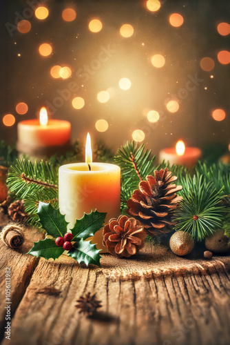 Warm Christmas Candle Arrangement with Pinecones, Holly, and Bokeh Lights for Cozy Holiday Ambiance