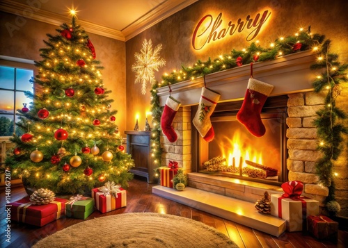Warm Christmas living room portrait: glowing tree, stockings by fireplace, gold "Merry Christmas" sign.
