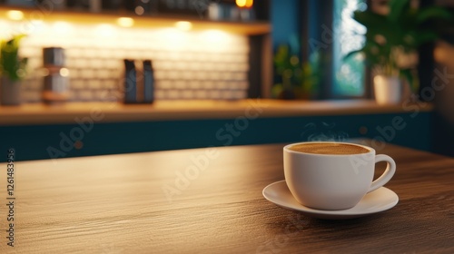 Warm Coffee Cup on Wooden Table in Cozy Cafe Setting