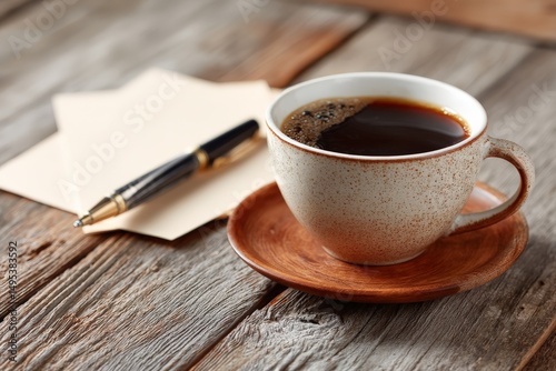Warm coffee cup resting on a wooden table next to a pen and papers in a cozy setting