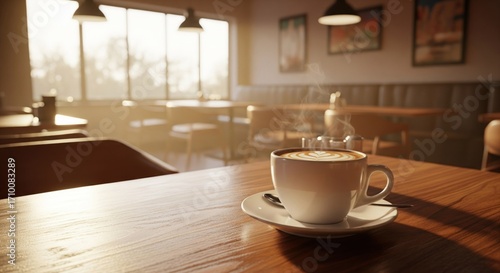 Warm coffee in a cafe at sunrise. Sunlight streams through large windows