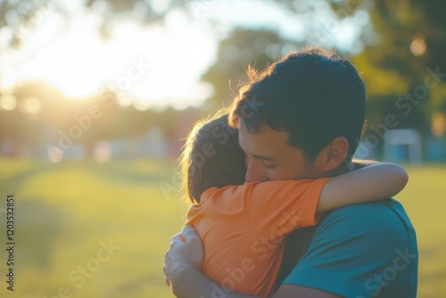 Warm embrace at sunset in a park creates a moment of connection between father and son during a summer evening. Generative AI
