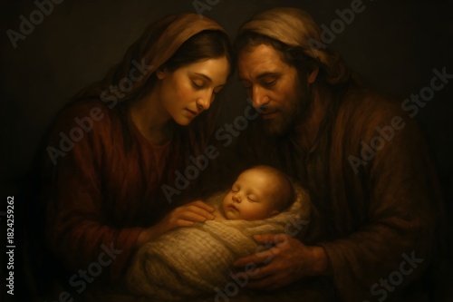 Warm illustration of a man and woman tenderly gazing at a sleeping baby, evoking sacred family love.