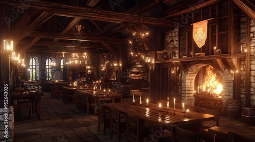 Warm medieval tavern with candle-lit wooden tables and a roaring fireplace Cozy ambiance with rich wood tones and soft flickering light detailed 3D rendering