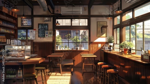 Warm sunlight fills a modern coffee shop, showcasing wooden interiors and a welcoming atmosphere perfect for relaxation or study