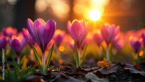 Warm sunset colors peeking through crocus petals, crocus, sun, colorful