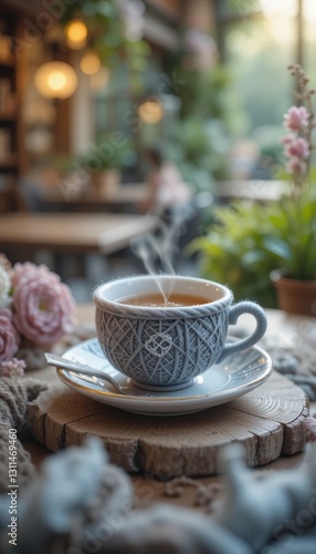 Warm Tea in Cozy Knit Cup at Relaxing Cafe Setting Steam Rises Above the Hot Drink